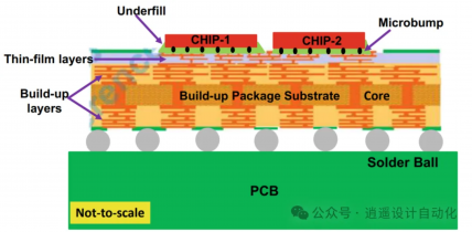 這種技術(shù)在構(gòu)建封裝基板頂部具有薄膜層。這些薄膜層的金屬線寬和間距可以小到2/2 μm,支持帶有微凸點(diǎn)的倒裝芯片。