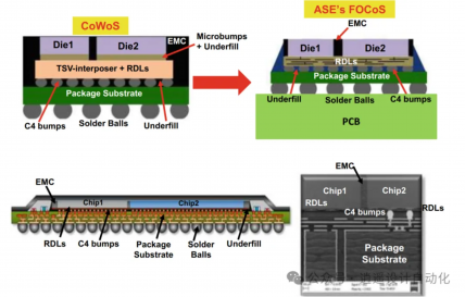這種技術(shù)涉及將多個(gè)芯片嵌入環(huán)氧模塑料(EMC)中,然后扇出重分布層(RDL)以連接到焊球。這種方法允許更高的集成密度和改進(jìn)的電氣性能。