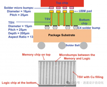 這種技術(shù)涉及垂直堆疊多個(gè)芯片并使用微凸點(diǎn)和TSV連接它們。頂部芯片使用微凸點(diǎn)連接到底部芯片(帶有TSV),整個(gè)模塊使用C4凸點(diǎn)附著到封裝基板上。