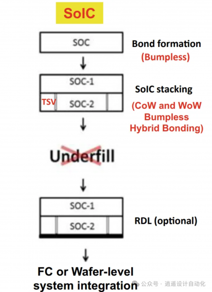這種新興技術(shù),如臺(tái)積電的SoIC(集成芯片系統(tǒng)),涉及通過芯片到晶圓(CoW)或晶圓到晶圓(WoW)工藝進(jìn)行無凸點(diǎn)混合鍵合Chiplet。它承諾更高的集成密度和性能。