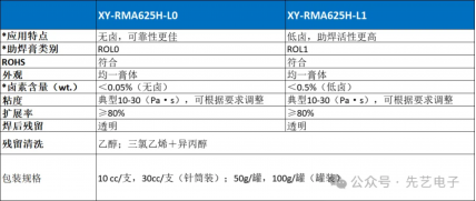 3、滿足多種工藝應(yīng)用需求:XY-RMA625H-L0和XY-RMA625H-L1兩款可用于金錫用助焊膏,可滿足客戶多種工藝需求