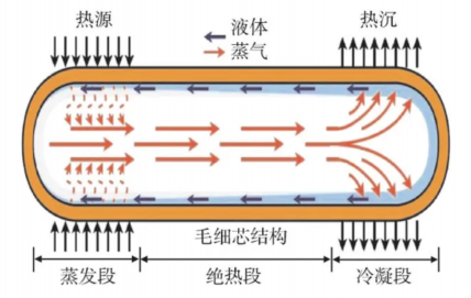 熱管技術(shù)通過相變原理進(jìn)行高效導(dǎo)熱。熱管內(nèi)部包含導(dǎo)熱液體,液體在靠近熱源的部分吸收熱量蒸發(fā)成氣體,氣體沿?zé)峁芤苿拥嚼涠酸尫艧崃坎⒛Y(jié)成液體,液體再通過毛細(xì)作用或重力回到熱源端循環(huán)。這種循環(huán)使得熱管能夠迅速傳導(dǎo)熱量。
