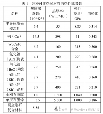 理想的過(guò)渡熱沉材料應(yīng)具有高熱導(dǎo)率,同時(shí)能與激光器芯片的熱膨脹系數(shù)相匹配。常用的過(guò)渡熱沉材料有氮化鋁陶瓷、氧化鈹陶瓷、碳化硅陶瓷、鎢銅合金、碳化硅晶片、金剛石薄膜片等,其相關(guān)熱性能參數(shù)如表 1 所示。