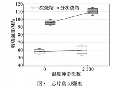 ①一次燒結(jié)工藝與分次燒結(jié)工藝的芯片剪切強(qiáng)度均達(dá)到了工業(yè)生產(chǎn)要求的標(biāo)準(zhǔn)值,但分次燒結(jié)工藝的銀燒結(jié)效果在組織結(jié)構(gòu)和力學(xué)性能上都要優(yōu)于一次燒結(jié)工藝,而溫度沖擊使得2種燒結(jié)工藝的芯片剪切強(qiáng)度都明顯增大,結(jié)合芯片剪切斷面觀察發(fā)現(xiàn)其斷裂路徑從界面轉(zhuǎn)向燒結(jié)層內(nèi)部。