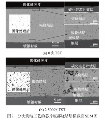 評價(jià)銀燒結(jié)顯微組織的幾個(gè)關(guān)鍵參數(shù)包含孔隙大小、孔隙率、孔隙的形狀和分布、晶粒尺寸??紫妒倾y燒結(jié)過程中銀顆粒之間的空隙,其形成取決于銀顆粒之間的燒結(jié)頸,以及隨后的燒結(jié)頸生長情況,燒結(jié)頸的形成依賴于燒結(jié)溫度,適當(dāng)提高燒結(jié)溫度和延長燒結(jié)時(shí)間有利于燒結(jié)頸的生長;適當(dāng)提高燒結(jié)壓強(qiáng)和燒結(jié)溫度可以減小燒結(jié)銀中的大孔隙,降低孔隙率,提高燒結(jié)銀的致密度[14]??紫稌馃崃骱碗娏骷?,增加燒結(jié)銀在實(shí)際應(yīng)用中失效的可能性;隨著孔隙率的增加,納米銀的導(dǎo)熱系數(shù)會降低,電阻率會增大[15]。如圖7所示,對分次燒結(jié)工藝的芯片底部燒結(jié)層橫截面使用掃描電鏡觀察其顯微組織,在此試驗(yàn)燒結(jié)條件下燒結(jié)后(0次TST)得到的銀燒結(jié)層是孔隙分布均勻且組織致密的多孔性結(jié)構(gòu),通過軟件對局部區(qū)域進(jìn)行灰度處理后,計(jì)算出孔隙率為1.98%;2500次TST后孔隙增大,晶粒尺寸也進(jìn)一步長大,孔隙率為8.31%;此外,在燒結(jié)層與襯板鍍銀層之間的界面觀察到明顯的孔隙增大,這是由于在溫度沖擊的作用下鍍銀層下面的銅原子會擴(kuò)散到襯板表面,繼而發(fā)生氧化,銅氧化物與銅或銀的熱膨脹系數(shù)不匹配,從而導(dǎo)致了較大的熱應(yīng)力,引起孔隙進(jìn)一步增大。