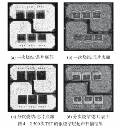 圖4為在2種燒結(jié)工藝條件下,經(jīng)過2500次溫度沖擊后的芯片底部和表面的燒結(jié)效果。由圖4可知,芯片底部和表面的燒結(jié)未發(fā)生明顯變化,未見明顯的空洞或者裂紋;但芯片表面的燒結(jié)銀面積縮小,均發(fā)生在芯片上的銅箔4個(gè)角的位置,這主要是由于溫度沖擊產(chǎn)生的應(yīng)力導(dǎo)致銅箔4個(gè)角位置卷起,從而導(dǎo)致超聲掃描結(jié)果顯示4個(gè)角位置的燒結(jié)銀面積縮小。