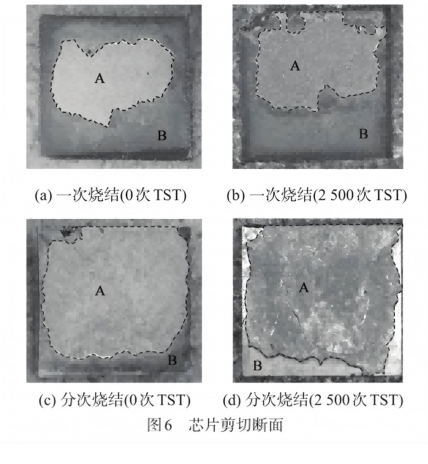 典型的剪切斷裂一般發(fā)生在銀燒結(jié)層(表示為“A”)或界面處(表示為“B”),也有可能是A與B的混合斷裂模式,一般在銀燒結(jié)層內(nèi)部斷裂是強(qiáng)接頭的表現(xiàn),而在界面處斷裂相對來說是弱接頭的表現(xiàn)[13]。如圖6所示,一次燒結(jié)工藝與分次燒結(jié)工藝的斷裂模式都是A與B的混合模式;觀察一次燒結(jié)工藝的芯片剪切斷面可發(fā)現(xiàn),A斷裂模式的所在位置正好是銅箔位置,也就是超聲掃描顯示顏色深的區(qū)域,如圖6(a)和圖6(b)所示,而B斷裂模式所對應(yīng)的位置則是超聲掃描顯示顏色相對淺的區(qū)域,如前所述銅箔覆蓋的區(qū)域所承受的壓力會大一些,其燒結(jié)效果更好,因此,此區(qū)域的斷裂模式是從燒結(jié)層內(nèi)部斷裂,但燒結(jié)效果差的區(qū)域則從芯片與燒結(jié)層的界面處斷裂;2500次TST后A斷裂模式的面積增大而B斷裂模式的面積減小,這也印證了TST后剪切強(qiáng)度增大的現(xiàn)象。分次燒結(jié)工藝的剪切強(qiáng)度明顯優(yōu)于一次燒結(jié)工藝,觀察芯片的剪切斷面,對比一次燒結(jié)工藝,分次燒結(jié)工藝的A斷裂模式面積明顯變大,如圖6(c)所示,覆蓋了芯片剪切斷面的大部分區(qū)域,說明此時(shí)是強(qiáng)接頭的表現(xiàn);此外,分次燒結(jié)工藝的樣品在2500次TST后A斷裂模式的面積也同樣增大,如圖6(d)所示。