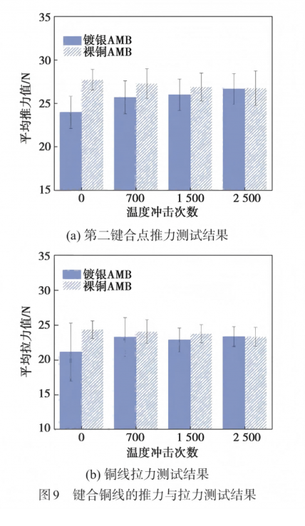 在超聲鍵合過程中,通過劈刀施加壓力使引線與焊區(qū)變形,結(jié)合超聲波振動促進(jìn)引線與焊區(qū)之間的相互摩擦,破壞引線與焊區(qū)表面的氧化膜,促進(jìn)鍵合界面處的相互擴(kuò)散,達(dá)到引線與焊區(qū)的固相鍵合。超聲鍵合的關(guān)鍵參數(shù)是超聲波振動功率、壓力和鍵合時(shí)間。壓力可造成引線的彈性變形,與壓力相比,超聲波振動更能促進(jìn)引線變形,影響引線的塑性變形。銅的強(qiáng)度和加工硬化性比鋁高,因此銅線超聲鍵合所需的超聲功率和壓力也相應(yīng)高一些。使用相同的工藝參數(shù)將銅線鍵合在鍍銀AMB與裸銅AMB上,如圖8所示,在不同溫度沖擊條件下隨機(jī)選取第二鍵合點(diǎn)的24個(gè)焊點(diǎn)進(jìn)行剪切試驗(yàn),同時(shí)在不同溫度沖擊條件下隨機(jī)選取24根鍵合銅線進(jìn)行拉力試驗(yàn)。圖9為2種材質(zhì)的襯板銅線鍵合后對第二鍵合點(diǎn)進(jìn)行剪切試驗(yàn)的平均推力值和拉力試驗(yàn)的平均拉力值。