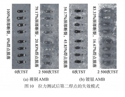 銅線拉力測試后第二焊點(diǎn)表現(xiàn)的失效模式主要有2種:頸部斷裂和焊點(diǎn)脫落。相對而言,頸部斷裂模式下的強(qiáng)度要高于焊點(diǎn)脫落模式。圖10為在裸銅AMB和鍍銀AMB上進(jìn)行銅線鍵合后第二焊點(diǎn)失效模式圖片和統(tǒng)計(jì)數(shù)據(jù)。由圖10(a)可知,燒結(jié)后(0次TST)的失效模式是頸部斷裂,這是由于在鍵合過程中焊點(diǎn)頸部的形變最大,導(dǎo)致這部分出現(xiàn)應(yīng)變硬化,延展性較差,容易發(fā)生斷裂;在經(jīng)歷2500次溫度沖擊后出現(xiàn)焊點(diǎn)脫落,失效占比約為20.83%,說明此時(shí)鍵合點(diǎn)與裸銅AMB界面之間的相互連接趨于弱化,這是由于溫度沖擊產(chǎn)生的熱應(yīng)力導(dǎo)致界面附近逐漸產(chǎn)生微裂紋并且長大,進(jìn)而表現(xiàn)出鍵合銅線的推拉力平均值逐漸下降的現(xiàn)象。由圖10(b)可知,燒結(jié)后(0次TST)的失效模式是頸部斷裂與焊點(diǎn)脫落,焊點(diǎn)脫落僅略低于頸部斷裂,失效占比約為45.83%,這表明此時(shí)鍵合銅線與鍍銀襯板的鍵合點(diǎn)界面之間結(jié)合得并不理想;然而在經(jīng)歷2500次溫度沖擊后,鍵合點(diǎn)的焊點(diǎn)脫落失效卻減少了,失效占比約為16.67%,表現(xiàn)為鍵合銅線的推拉力平均值逐漸上升,這可能是由于鍵合界面處的銅原子與銀原子在溫度的作用下相互擴(kuò)散,導(dǎo)致界面金屬之間出現(xiàn)化合物,使得鍵合強(qiáng)度增加,但持續(xù)增加溫度沖擊次數(shù)對其鍵合點(diǎn)力學(xué)性能的影響還有待進(jìn)一步研究。