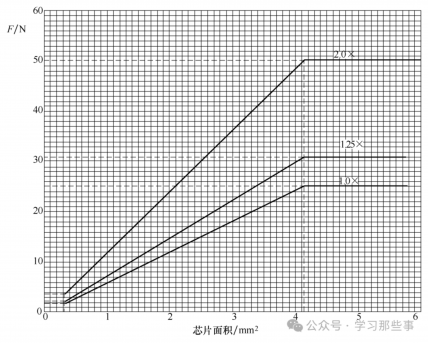 當(dāng)芯片粘結(jié)面積介于0.32mm2(含)至3.14mm2之間時,芯片承受的最小剪切強(qiáng)度,可參照圖1所示標(biāo)準(zhǔn)確定。