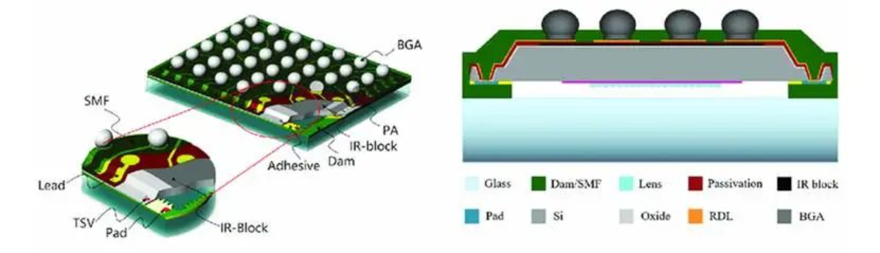此類(lèi)集成方案已率先應(yīng)用于移動(dòng)端CMOS圖像傳感器封裝,近期更延伸至汽車(chē)電子傳感領(lǐng)域?;陔姎饣ミB路徑縮短、封裝尺寸微型化及低成本優(yōu)勢(shì),采用硅通孔(TSV)的三維晶圓級(jí)芯片尺寸封裝(3D WLCSP)正逐步取代傳統(tǒng)板上芯片(COB)封裝技術(shù)。與大多數(shù)汽車(chē)級(jí)應(yīng)用類(lèi)似,該技術(shù)面臨的核心挑戰(zhàn)在于滿(mǎn)足嚴(yán)苛的可靠性標(biāo)準(zhǔn):如圖7所示,專(zhuān)為汽車(chē)CMOS圖像傳感器背面照明(BSI)設(shè)計(jì)的封裝結(jié)構(gòu),其尺寸為5.82mm×5.22mm、厚度850μm,采用深寬比3:1的TSV技術(shù),硅材料占封裝體積比例高達(dá)99.27%。