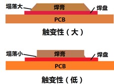 圖2 印刷過(guò)程中焊膏粘度的變化 4.2 密度、合金與釬劑配比 前面已經(jīng)提到,焊膏中合金釬料粉和釬劑的組成以及兩者的配比對(duì)焊膏的特性有很大影響。通常在介紹焊膏時(shí)必須說(shuō)明合金釬料粉的成份、配比以及釬料粉與釬劑的配比或者釬劑的含量。而焊膏的密度直觀(guān)地反映了焊膏中合金粉的組成以及釬劑的含量,也可作為影響焊膏性能的重要參數(shù)。 (1) 熔點(diǎn)與相應(yīng)的再流焊溫度 焊膏的熔點(diǎn)主要取決于合金釬料粉的成份與配比。隨著焊膏組成和熔點(diǎn)的不同,需采用不同的再流焊溫度,而焊接效果和性能也各不相同。 (2) 合金釬料粉的形狀和粒度 大多數(shù)焊膏都采用球形釬料粉,而粒度最適用的范圍為200-325目,超出此范圍的釬料粉以不多于10%為宜。對(duì)細(xì)間距器件的組裝,需采用更細(xì)的釬料粉,其粒度為270-500目或325-500目。 4.3 觸變指數(shù)和塌落度 焊膏作為觸變性流體,觸變指數(shù)是其重要參數(shù)。 焊膏的塌落度主要與焊膏的粘度和觸變性有關(guān),即焊膏的粘度和觸變性在很大程度上控制著印刷后圖形的保持特性,而且也影響著再流焊后焊膏的塌落情況,圖3反映了焊膏觸變指數(shù)與塌落度的關(guān)系。當(dāng)觸變指數(shù)高,塌落度就小,而觸變指數(shù)低則塌落度。