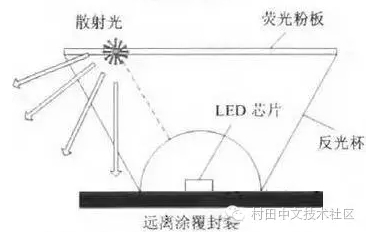 此外還有一種涂覆方法是使熒光粉層遠(yuǎn)離LED芯片(例如使熒光粉層位于LED芯片外的反光杯或散光杯上),則可大幅減少被熒光粉層反射回芯片而被吸收的光 量,從而提高了出光效率。另外,由于熒光粉層與芯片無直接接觸,芯片產(chǎn)生的熱量不會(huì)傳遞到熒光粉層,從而延長了熒光粉層的使用壽命。倫斯特理工學(xué)院的 Schubert等人的研究發(fā)現(xiàn),利用遠(yuǎn)離熒光粉涂覆工藝可以減少向后散熱的光線被芯片吸收的概率,可將LED的發(fā)光效率提高7%~16%。中山大學(xué)王剛等人也展開了相關(guān)研究,結(jié)果表明采用遠(yuǎn)離熒光粉涂層可降低熒光粉涂層溫度約16.8℃,顯著提高熒光粉的轉(zhuǎn)換效率。但是遠(yuǎn)離涂覆法也有其缺點(diǎn),因?yàn)槌鲇趯?duì) 其使用熒光粉量較多,熒光粉版的制造與安裝工藝也相對(duì)較復(fù)雜等成本問題上的考慮,目前也無法得到廣泛推廣及工業(yè)應(yīng)用。