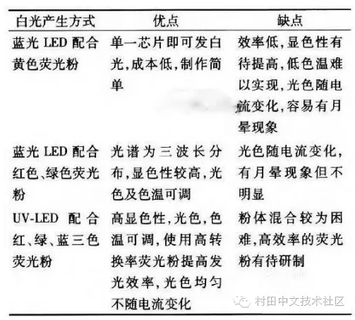 目前采用熒光粉產(chǎn)生白光共有三種方式:藍(lán)光LED配合黃色熒光粉;藍(lán)光LED配合紅色、綠色熒光粉;UV-LED配合紅、綠、藍(lán)三色熒光粉。其中商品化的 白光LED多屬藍(lán)光LED配合黃色熒光粉的單芯片型,藍(lán)光LED配合紅色、綠色熒光粉的白光產(chǎn)生方式只是在OSRAM、Lumileds等公司的專利上報(bào) 道過,但仍未有商品化產(chǎn)品出現(xiàn),而UV-LED配合三色熒光粉的方式目前也尚處于開發(fā)中。不同熒光粉產(chǎn)生白光LED的優(yōu)缺點(diǎn)比較見下表。