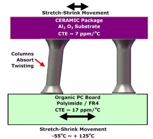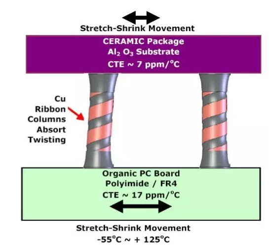 圖5為螺旋錫柱柱柵陣列封裝,每根錫柱由63Sn/37Pb共晶焊料焊接在基板上,焊錫列作為一個標(biāo)準(zhǔn)的互連從而減少在極端熱循環(huán)條件下的焊接疲勞。