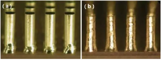 圖9 焊柱失效模式圖 (a)普通錫柱 (b)螺旋錫柱