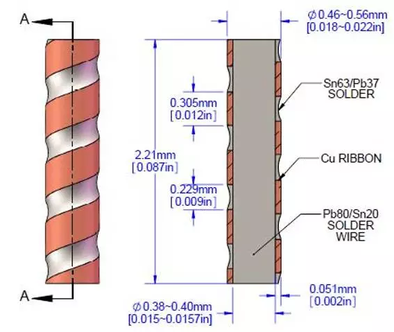 圖3為一種常用規(guī)格螺旋錫柱及其截面示意圖。中心為80Pb/20Sn錫絲,表面繞厚度為0.051mm的銅箔,然后整體覆一層63Sn/37Pb共晶焊料將錫柱包裹。