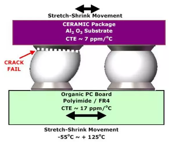 圖6、7、8分別為錫球、普通錫柱、螺旋錫柱大溫度波動測試結(jié)果(產(chǎn)生陶瓷柱柵陣列和PCB板間的剪切應(yīng)力)(熱膨脹系數(shù)失配度~10ppm/oC)??梢钥闯觯a球?qū)μ沾苫搴蚉CB之間因CTE不匹配而產(chǎn)生的應(yīng)力適應(yīng)力較差,焊點出現(xiàn)了坍塌。CCGA因連接高度增加后,焊點上的應(yīng)力將通過焊柱的彎曲來進行釋放,從而能更好地適應(yīng)陶瓷基板和PCB之間因CTE不匹配而產(chǎn)生的應(yīng)力。而螺旋錫柱較普通錫柱傾斜度更小,對此剪切應(yīng)力的吸收能力更強,具有更好的支撐能力。