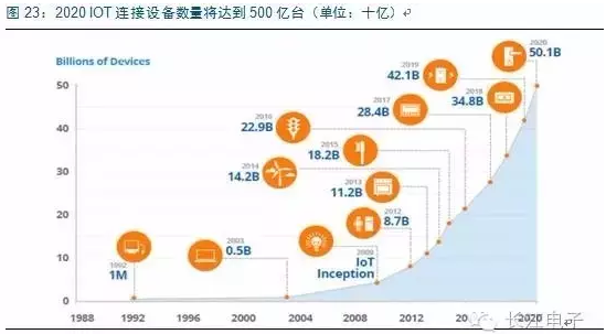 傳感器作為感知層的重要組成部分,在物聯(lián)網(wǎng)時(shí)代不可替代,MEMS作為支撐技術(shù),也將發(fā)揮重要作用。預(yù)計(jì)2020年全球物聯(lián)網(wǎng)市場(chǎng)市值將增至1.7萬(wàn)億美元,約有500億臺(tái)設(shè)備接入物聯(lián)網(wǎng),物聯(lián)網(wǎng)是繼汽車電子、智能手機(jī)、可穿戴設(shè)備后MEMS的下一個(gè)核心驅(qū)動(dòng)力。