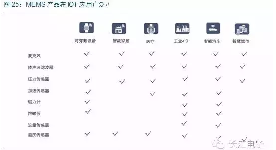 MEMS技術(shù)在可穿戴設(shè)備、智能家居、醫(yī)療、工業(yè)4.0、智能汽車、智慧城市等IOT細(xì)分領(lǐng)域都有廣泛的應(yīng)用,常見的MEMS傳感器諸如麥克風(fēng)、體聲波濾波器、壓力傳感器、溫度傳感器等都存在豐富的應(yīng)用場(chǎng)景。