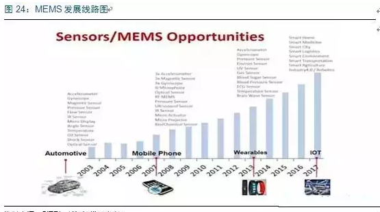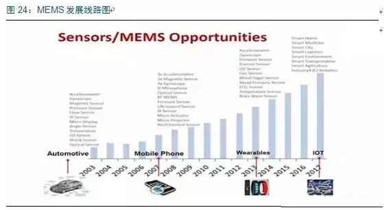 MEMS的傳感器發(fā)展共經(jīng)歷了三個(gè)階段,分別對(duì)應(yīng)不同的驅(qū)動(dòng)力。2000年左右是汽車電子、2007年左右是智能手機(jī)、2013年左右是可穿戴設(shè)備,下一個(gè)驅(qū)動(dòng)MEMS的傳感器發(fā)展的動(dòng)力是物聯(lián)網(wǎng),業(yè)界預(yù)測(cè)全球傳感器需求有望從當(dāng)前的百億級(jí)激增到2025年的Trillion-Sensor(TSensor,萬(wàn)億-傳感器)量級(jí)。