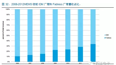 MEMS行業(yè)中Fabless的份額由2006年的10%增加到2012年的32%左右,正如集成電路行業(yè)所經(jīng)歷由的一樣,行業(yè)細(xì)化和分工的趨勢(shì)不可逆轉(zhuǎn)。MEMS傳感器行業(yè)的品種多達(dá)上萬(wàn)種,單品種的銷量很難放大,在價(jià)格不斷走低的情況下,企業(yè)很難盈利,無(wú)法承受大規(guī)模的資本支出。面對(duì)不斷增長(zhǎng)的市場(chǎng)規(guī)模,迫切想進(jìn)入的中小設(shè)計(jì)廠商有很強(qiáng)的代工需求,F(xiàn)abless存在的價(jià)值日益凸顯。除此之外,由于市場(chǎng)規(guī)模相對(duì)過(guò)小,缺乏統(tǒng)一工藝,傳統(tǒng)的集成電路代工廠商如臺(tái)積電, 聯(lián)電, 中芯國(guó)際等一線代工廠商較之新進(jìn)入的MEMS代工企業(yè)賽萊克斯和Tronics、IMT并無(wú)絕對(duì)的優(yōu)勢(shì),這就給專注于MEMS代工廠商留下了更大的發(fā)展空間。