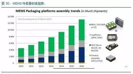 MEMS主要的封裝技術(shù)為BGA/LGA和 WLP,近年來(lái)WLP份額增長(zhǎng)較快,2016年幾乎與BGA/LGA持平,是MEMS領(lǐng)域最有潛力的封裝技術(shù)。
