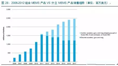 根據(jù)HIS的數(shù)據(jù),組合傳感器市場(chǎng)在2011年之后占比逐步上升,預(yù)計(jì)到2017年一半的MEMS產(chǎn)品是組合形式。慣性傳感器的價(jià)值已經(jīng)嚴(yán)重下滑,從分立傳感器轉(zhuǎn)向組合傳感器,三軸分立傳感器,甚至六軸組合傳感器的價(jià)格已經(jīng)非常低了,集成三軸陀螺儀,三軸加速傳感器,三軸磁感應(yīng)傳感器的九軸慣性傳感器將有明顯優(yōu)勢(shì)。