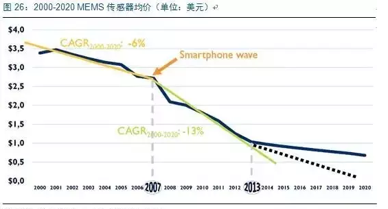 2001-2007年間,MEMS傳感器均價(jià)由3.5美元降低到接近2.7美元,CAGR為-6%;2007-2013年間,MEMS傳感器均價(jià)由接近2.7美元降低到1美元,CAGR為-13%。過(guò)去五年MEMS市場(chǎng)參與者不斷增加,尤其移動(dòng)端貨量急劇增長(zhǎng),給價(jià)格帶來(lái)了較大的壓力,市場(chǎng)有內(nèi)在出清的需求。