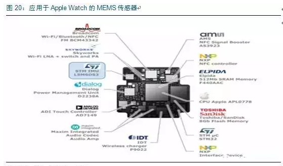 在可穿戴智能設(shè)備上,傳感器的使用更為廣泛。AppleWatch配置的MEMS傳感器超過(guò)十種。