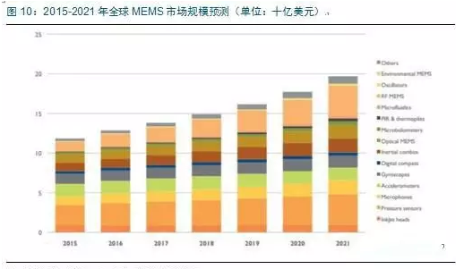 MEMS是集成電路相對(duì)景氣的子領(lǐng)域,預(yù)計(jì)到2021年全球MEMS產(chǎn)業(yè)規(guī)模將達(dá)到200億美元,2015-2021復(fù)合增長(zhǎng)率為8.9%,增速遠(yuǎn)高于集成電路行業(yè)平均水平,同時(shí)受移動(dòng)設(shè)備市場(chǎng)逐步飽和的沖擊,增速有所放緩。國(guó)內(nèi)增速快于國(guó)外,消費(fèi)電子、醫(yī)療和工業(yè)控制等細(xì)分領(lǐng)域引領(lǐng)市場(chǎng)。