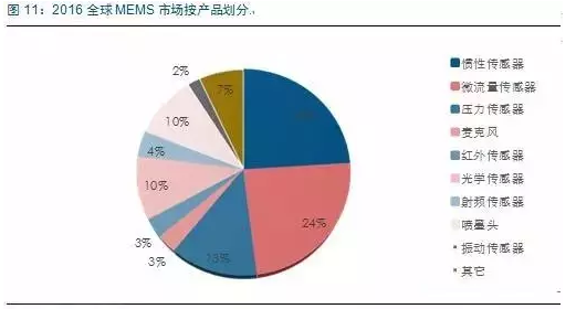 預(yù)計(jì)2016年,MEMS按產(chǎn)品線劃分占主導(dǎo)低位的依然是慣性傳感器和微流量傳感器,占比都為24%左右,其次是壓力傳感器,占比為13%,光學(xué)傳感器和噴墨頭,占比都為10%左右。