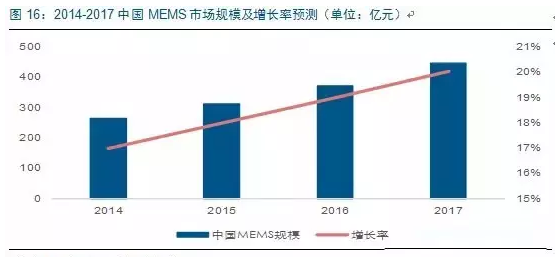 據(jù)賽迪顧問(wèn)的研究數(shù)據(jù),2014年中國(guó)MEMS器件市場(chǎng)規(guī)模為265億元人民幣,占據(jù)全球市場(chǎng)的三分之一。從發(fā)展速度而言,中國(guó)MEMS市場(chǎng)增速一直快于全球市場(chǎng)增速。2014年中國(guó)MEMS器件市場(chǎng)增速高達(dá)17%,中國(guó)集成電路市場(chǎng)增速為9%,橫向?qū)Ρ榷?,MEMS器件市場(chǎng)的增速兩倍于集成電路市場(chǎng)。預(yù)計(jì)到2017年,國(guó)內(nèi)MEMS市場(chǎng)規(guī)模將達(dá)到400-450億元,2014-2017復(fù)合增長(zhǎng)率為19%。在較為樂(lè)觀情況下,按照賽迪的遠(yuǎn)景預(yù)測(cè),整個(gè)中國(guó)MEMS市場(chǎng)有望形成接近1000億人民幣的龐大市場(chǎng)。