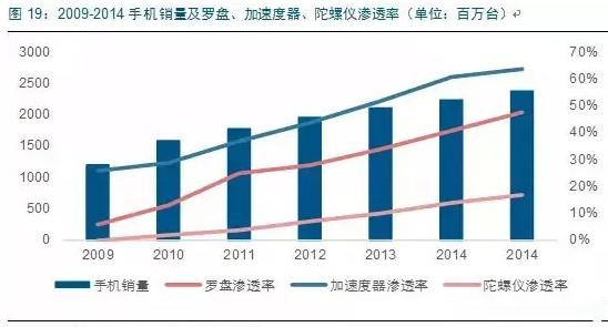 截至到2014年,常見的三種用于智能手機(jī)的羅盤傳感器、加速度器傳感器、陀螺儀滲透率分別為48%、64%、17%,陀螺儀滲透率偏低,通常在高端機(jī)型上有配置。