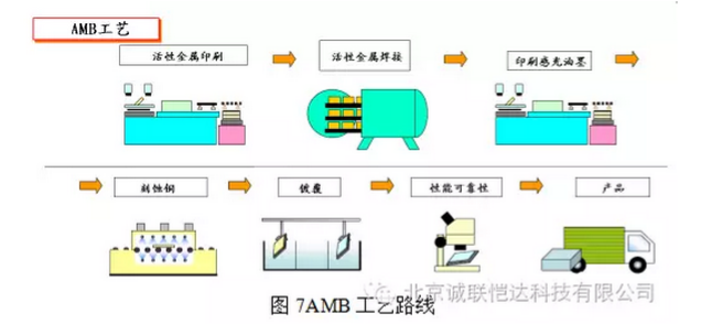 活性焊銅工藝是DBC工藝技術(shù)的進(jìn)一步發(fā)展,它是利用釬料中含有的少量活性元素與陶瓷反應(yīng)生成能被液態(tài)釬料潤(rùn)濕的反應(yīng)層,從而實(shí)現(xiàn)陶瓷與金屬接合的一種方法。該工藝路線如圖7所示:先將陶瓷表面印刷活性金屬焊料而后與無(wú)氧銅裝夾后在真空釬焊爐中高溫焊接,覆接完畢基板采用類似于PCB板的濕法刻蝕工藝在表面制作電路,最后表面鍍覆制備出性能可靠的產(chǎn)品。AMB基板是靠陶瓷與活性金屬焊膏在高溫下進(jìn)行化學(xué)反應(yīng)來(lái)實(shí)現(xiàn)結(jié)合,因此其結(jié)合強(qiáng)度更高,可靠性更好。但是由于該方法成本較高、合適的焊料較少、焊料對(duì)于焊接的可靠性影響較大,只有日本幾家公司掌握了高可靠活性金屬焊接技術(shù).