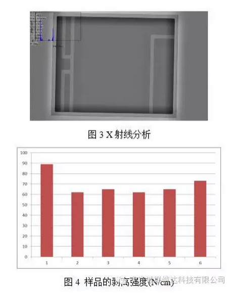 基于上述基礎(chǔ)理論,我們系統(tǒng)研究了氮化鋁陶瓷表面氧化、無(wú)氧銅氧化以及直接覆銅等工藝,優(yōu)化了工藝參數(shù),制備出氮化鋁陶瓷覆銅板。采用X射線對(duì)樣品進(jìn)行分析如圖3所示??梢钥闯觯瑯悠穬?nèi)部沒有發(fā)現(xiàn)明顯空洞存在,特別是芯區(qū)無(wú)空洞,上下界面空洞含量均小于3%。將樣品切成10mm寬的長(zhǎng)條預(yù)制切口,測(cè)試銅從陶瓷表面拉起的拉力,結(jié)果如圖4所示,樣品的剝離強(qiáng)度均大于60N/cm。