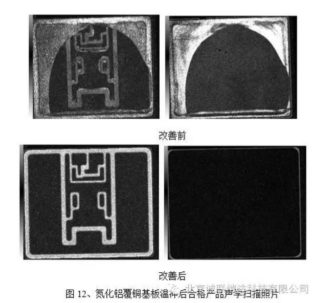 氮化鋁覆銅基板批溫度沖擊的可靠性是其性能的關(guān)鍵因素,要求氮化鋁覆銅基板在芯片焊接完成后,要能承受-40℃~+150℃,100次的溫度循環(huán)。我們對(duì)氮化鋁陶瓷覆銅基板開展了一系列優(yōu)化,包括覆銅基板的設(shè)計(jì)優(yōu)化和覆銅基板的工藝優(yōu)化,最終完全達(dá)到了溫度循環(huán)可靠性要求。改善前后氮化鋁覆銅板經(jīng)過(guò)溫度循環(huán)后焊接情況如圖12所示。
