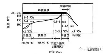 電子組裝中采用的軟釬焊技術(shù)中主要采用的是紅外法以及對流法,但在應(yīng)用的過程中對產(chǎn)品成品率以及焊點完整性工藝造成影響的因素包括:對基板及焊膏進行預(yù)熱的溫度和時間、峰值溫度以及在峰值溫度的過程中所停留的時間、冷卻速率等。而常用錫鉛焊膏再流焊溫度曲線如圖2所示: