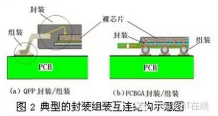 從技術(shù)本質(zhì)來說,封裝與組裝都是為了實現(xiàn)電路的電氣互聯(lián),只不過封裝是實現(xiàn)“芯片級”互聯(lián),而組裝則是“板卡級”互聯(lián),二者都是互聯(lián)過程的“二傳手”而已。有關(guān)電氣互連將在后面章節(jié)專門討論,這里我們從直觀看它們的聯(lián)系,如所示,是目前典型的QFP(圖2a)與BGA(圖2b)封裝組裝互連結(jié)構(gòu)示意圖。