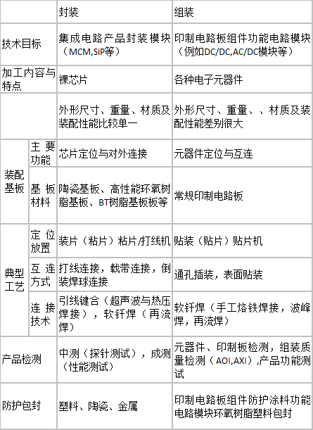 封裝與組裝技術(shù)的主要就是元素和技術(shù)環(huán)節(jié)有許多彼此相通的地方,有些環(huán)節(jié)實際是完全一致的,只不過不同領(lǐng)域側(cè)重點有差異而已。封裝與組裝技術(shù)比較見表1。