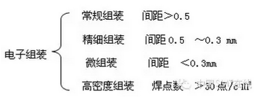 上述分類中,“微組裝”和“高密度組裝”是從不同角度區(qū)分的,二者在有些情況下可能是相互覆蓋的。實際上當0603、0402(公制)片式元件應(yīng)用之后,元件間距已經(jīng)小于0.3 mm,但人們并沒有認為已經(jīng)進入微組裝技術(shù)領(lǐng)域。