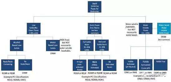 活性和固體含量通常是助焊劑的兩個關鍵屬性,決定了產(chǎn)品在焊接后是否需要清洗助焊劑的殘留物。根據(jù)材料的類型和固體含量,助焊劑的分類還可以進一步細分,如圖1的樹形圖所示。